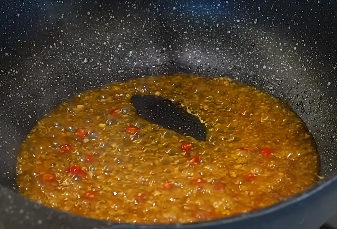 4、 熱鍋冷油,放入大蒜炒出香味兒,再放入小米辣,倒入調味汁,煮成粘稠的汁兒。