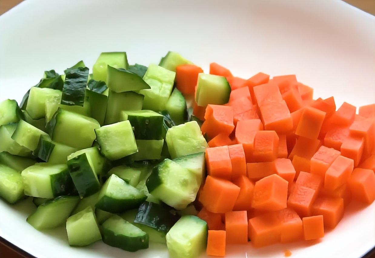 5、 黃瓜切成小塊,胡蘿蔔切成小塊兒。