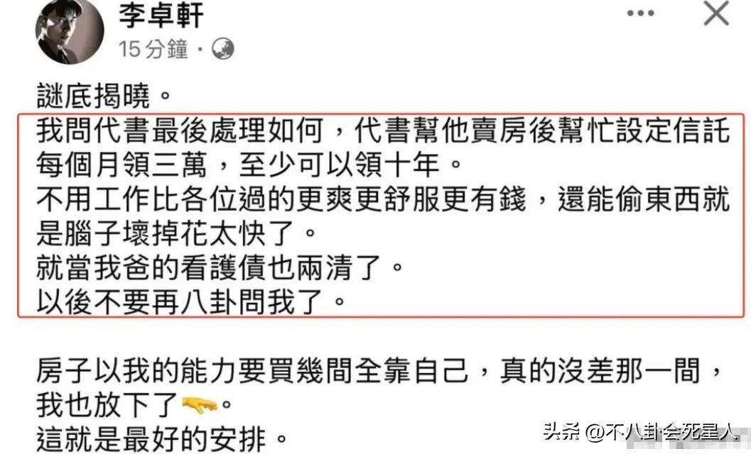 根據媒體最新消息,李坤城的兒子表示,父親去世後留下的房產已經被變賣並且成立了信託基金,而作爲李坤城的遺孀,林靖恩每個月能從信託基金裏領取3萬臺幣的生活費,摺合人民幣大概是6700元。