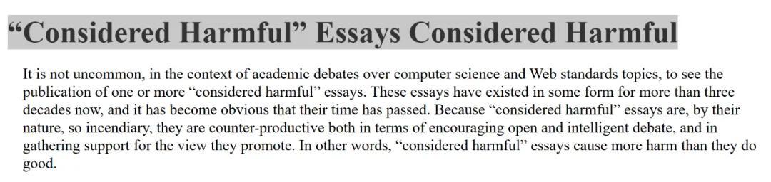 隨後各種“有害論”的文章雨後春筍般湧現,如今在谷歌學術上以considered harmful爲關鍵詞的搜索結果有六萬多條。