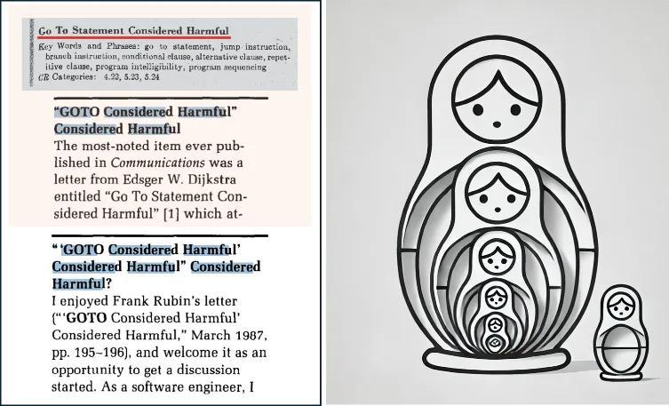 令所有人都始料不及的是,Wirth靈機一動的神來之筆就好像執行了一條後果不明的goto語句,一下子帶火了X cosidered harmful這個大衆媒體中“吸睛”效果滿滿卻早已不新鮮的爛梗,帶癲了計算機學術界。
