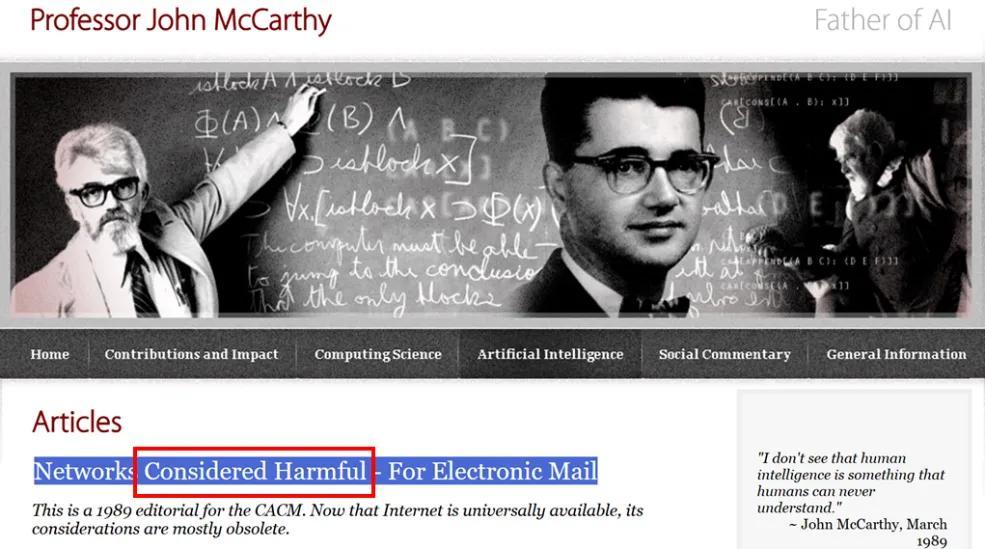其中就有一些放在今天看來讓人莞爾的觀點。比如“人工智能之父”、1971 年圖靈獎得主 John McCarthy 發表過一篇文章,標題是《網絡對電子郵件有害》。