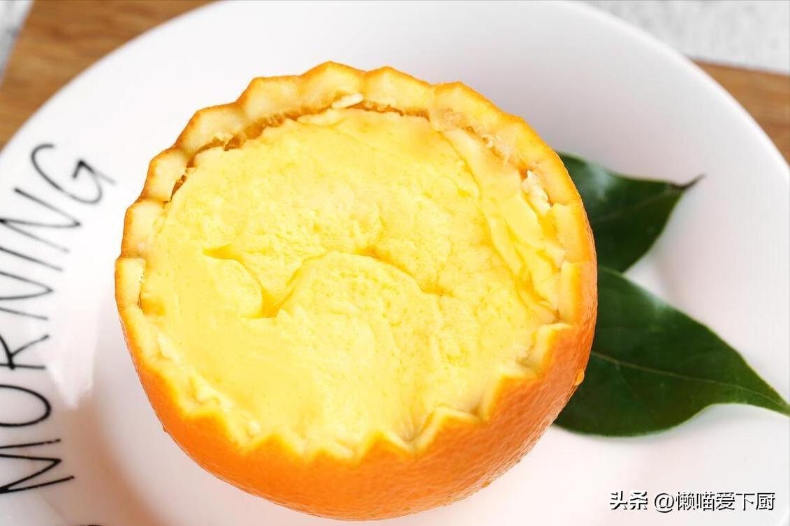 將攪好的蛋液過篩入橙子皮中,再將切下來的部分蓋回去。