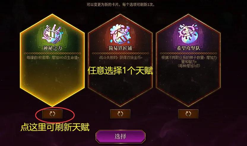 在第1/3/5階段通關後,會隨機刷出3種天賦選擇,同時每個天賦還可以再手動刷新一次。