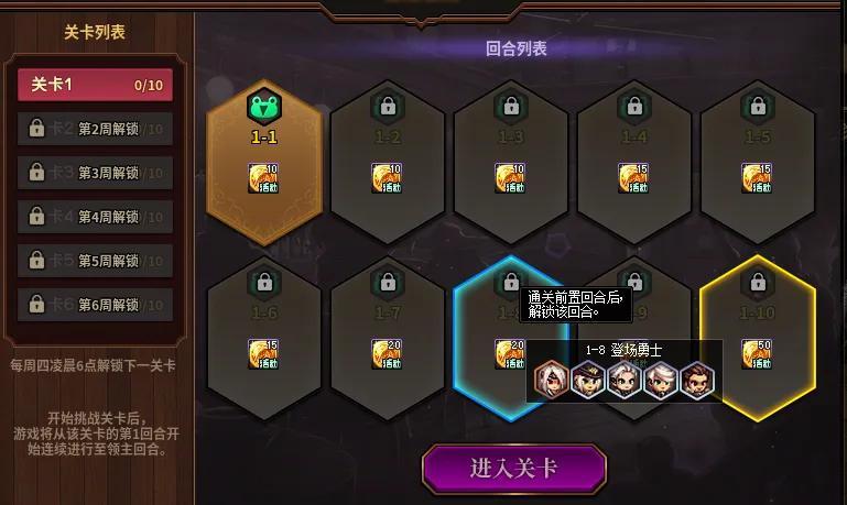 “劇情模式”總共有6個關卡,每週解鎖1個關卡,每個關卡又分爲10個小關,