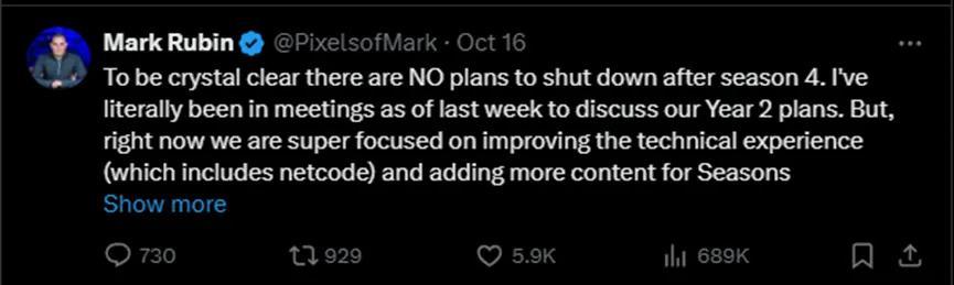 然而,在一個多月前的X上,Mark Rubin纔剛剛澄清過關停遊戲的謠言。他在10月16日透露說,已徑參加《不羈聯盟》討論來年開發計劃的會議,承諾玩家將會改善技術,再接再厲地爲第三和第四賽季增加更多內容。