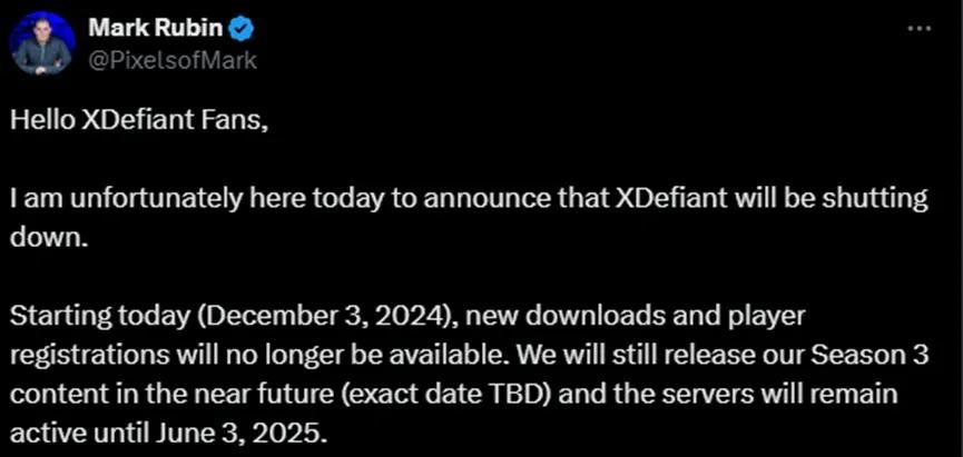 2024年12月3日,育碧旗下FPS遊戲《不羈聯盟》(XDefiant)的執行製作人Mark Rubin在X上發佈了一封給玩家的信,稱遊戲即將關停: