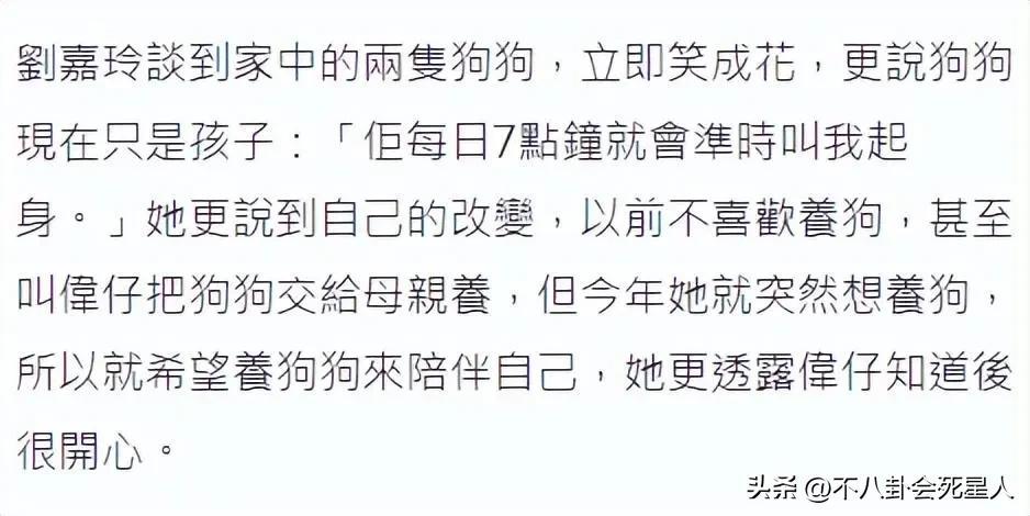 劉嘉玲前不久還透露,自己已經開始養了兩隻寵物狗作伴。她說一開始是梁朝偉喜歡狗,但她不喜歡所以沒養,現在她改變了想法就開始養了兩隻狗,梁朝偉也爲此感到很開心,還會每天提醒劉嘉玲遛狗。