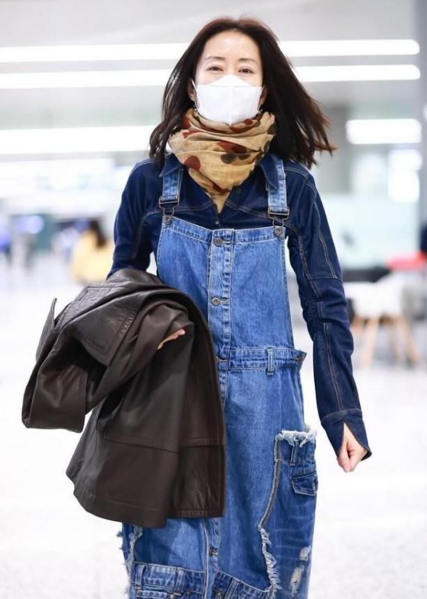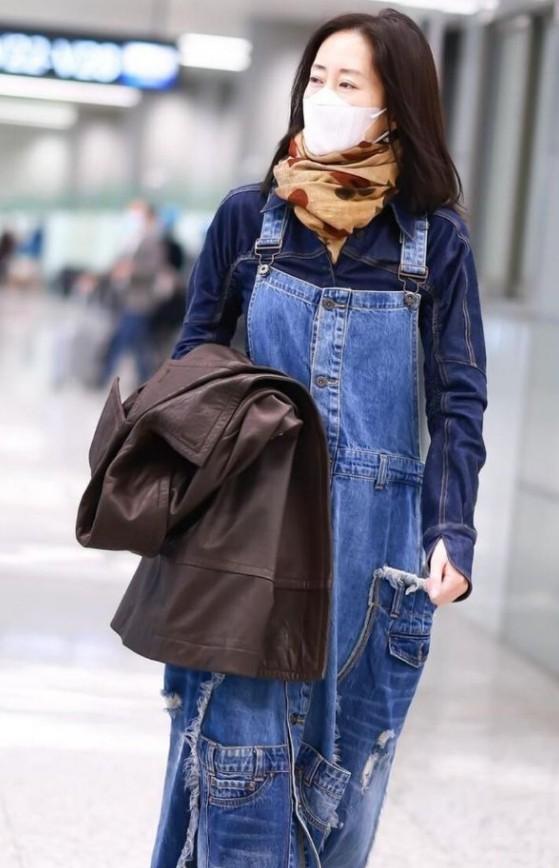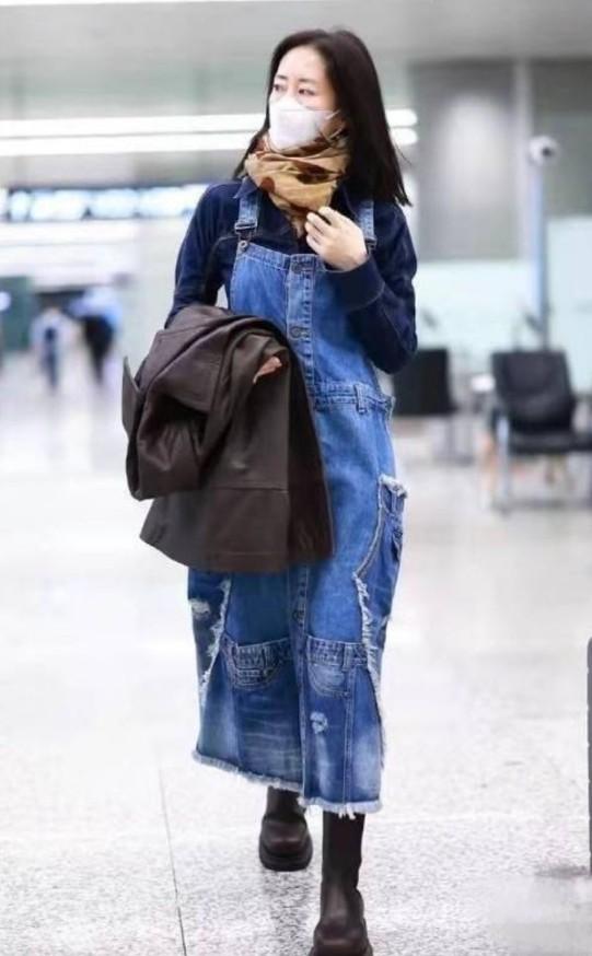 48歲劉敏濤帶火一種新穿法,牛仔衫外面套牛仔裙,這是什麼新時尚