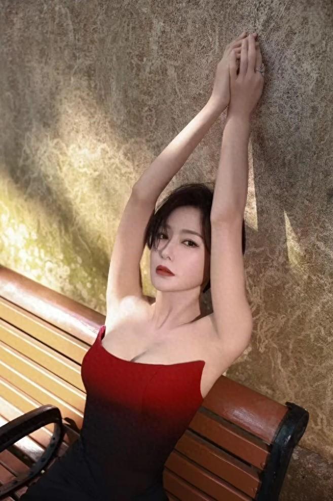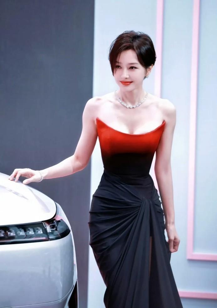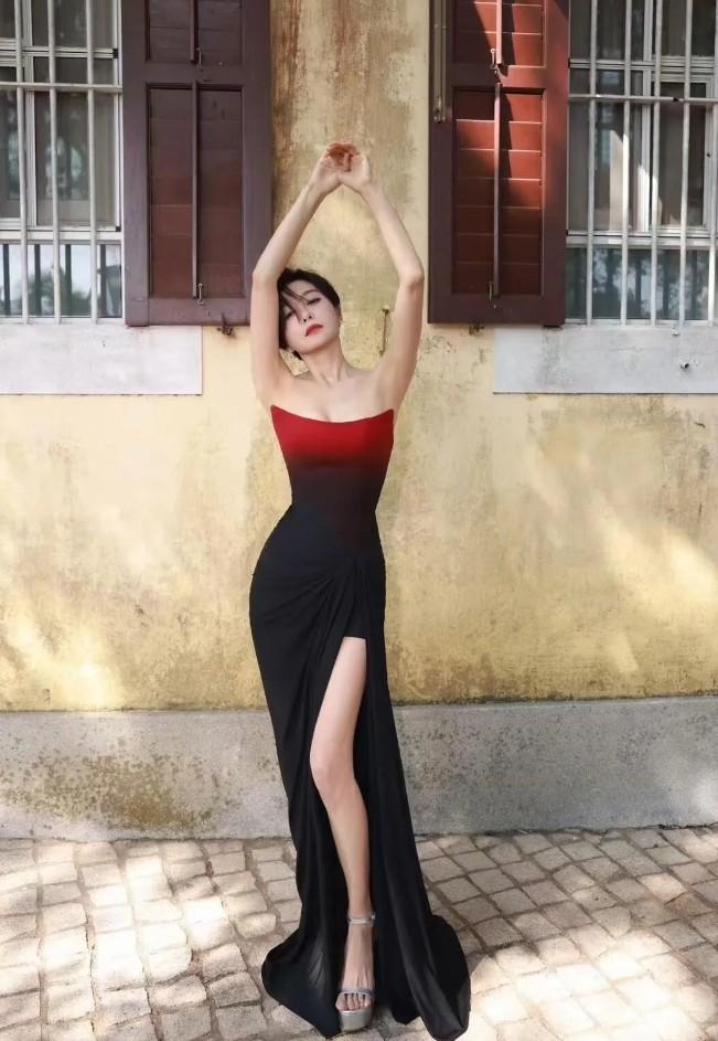 除了髮型選對了以外,秦嵐這一次挑選的禮服裙,也很顯她的身材,抹胸款式的高開叉拖尾長裙,配短髮顯得又颯又欲,胸口處的弧形設計,很好的隱藏住了副乳,並且也讓造型更時髦了。