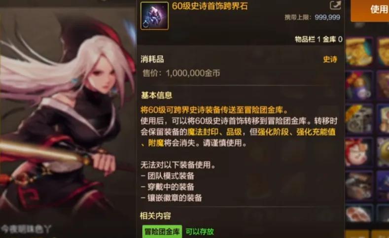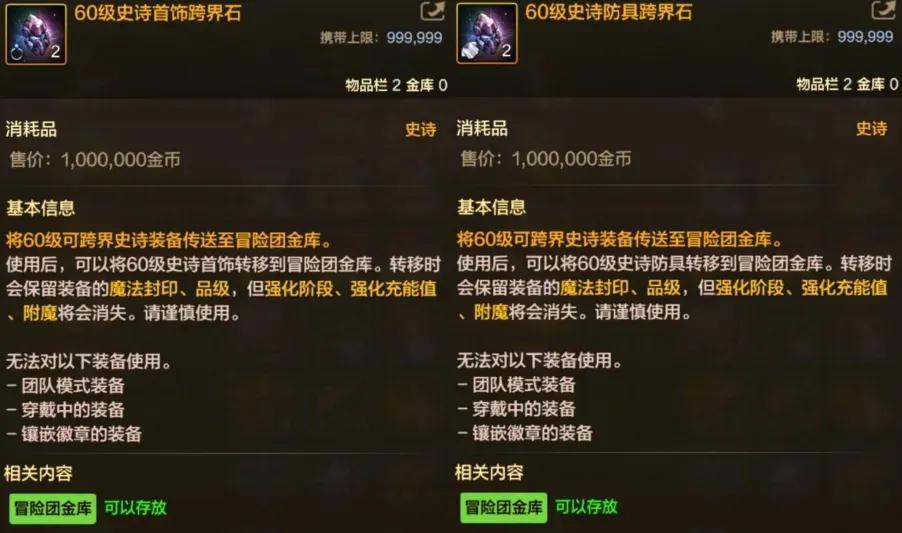 一種是“防具跨界石”,可將60級防具轉移到冒險團金庫中。