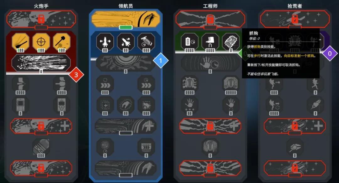 就像之前提到的,《Void Crew》以技能樹的形式,爲飛船的駕駛維護設計出了四種職業天賦樹,分別是“火炮手”“領航員”“工程師 ”“拾荒者”: