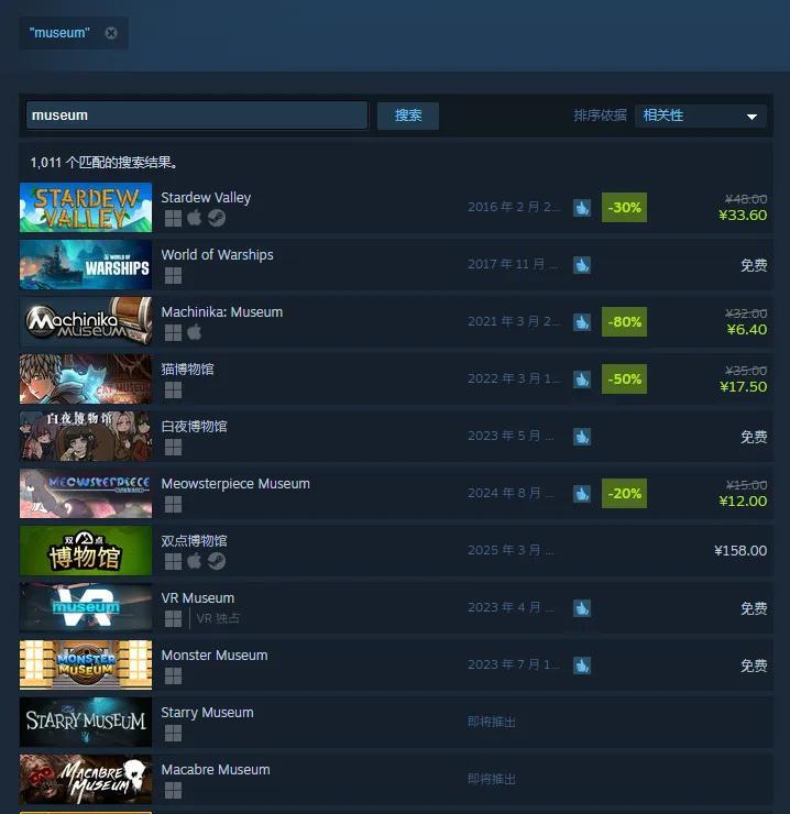 在Steam上搜索“博物館”關鍵字,跳出來的也大多都是從博物館中逃離的恐怖驚悚遊戲,或是在博物館中解密探索的劇情向冒險遊戲。