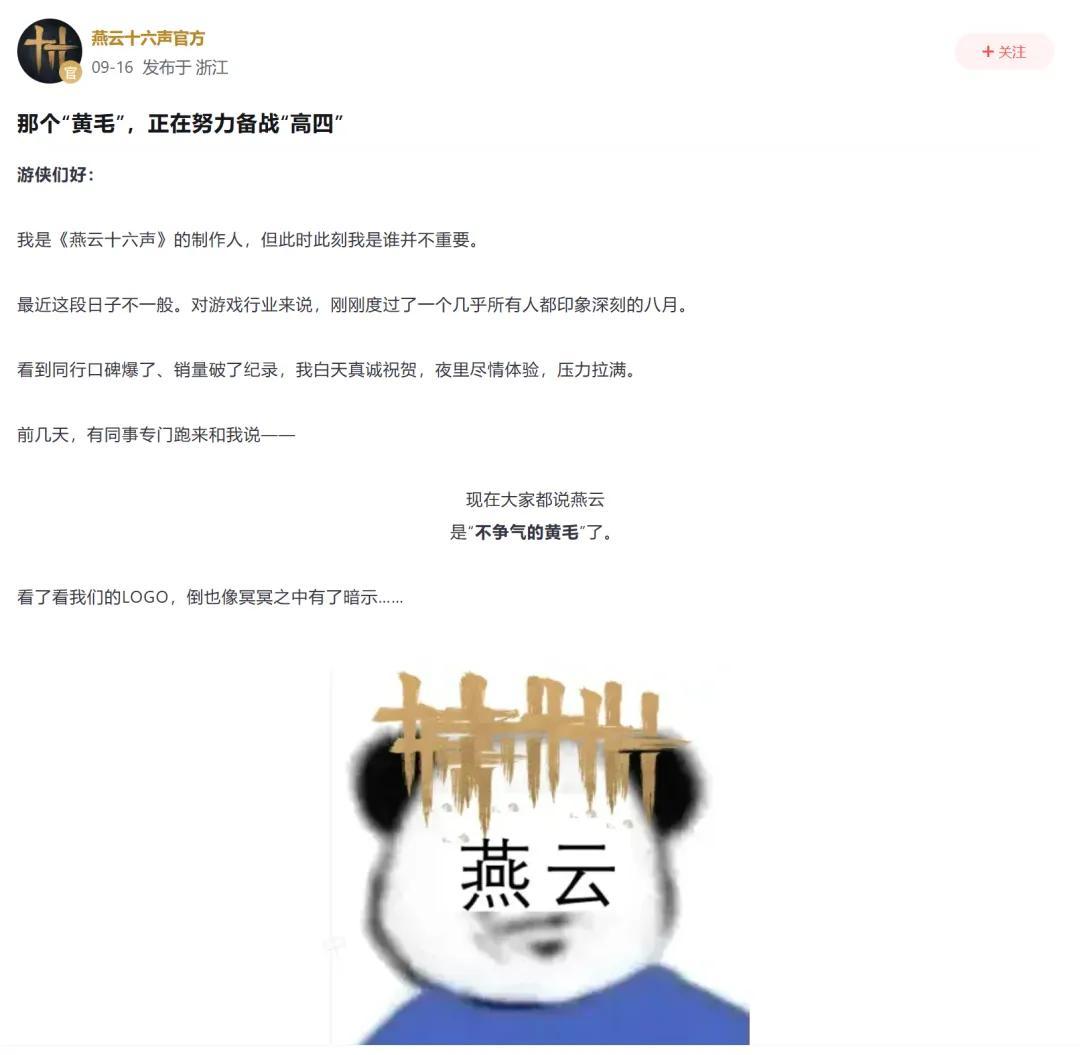 緊接着《黑神話:悟空》在8月發售,“國產3A”突然有了具象化的標杆,燕雲的輿論處境變得更加被動。人家是“村裏出的第一個大學生”,燕雲這邊就只能順着玩家們的說法,自嘲是“村裏的黃毛”。