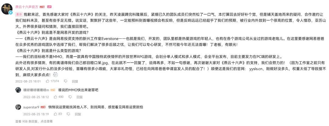 在這個階段,可以說項目組的目標和玩家們的期待其實很統一——《燕雲十六聲》希望成爲一個有辨識度的武俠遊戲,想要通過單機內容來提供足夠深厚的“沉浸感”;玩家會投來關注,也就是覺得燕雲看起來和市面上現有的武俠遊戲確實不太一樣,審美在線,玩法有想象力。工作室對網易的投資背景也沒避嫌,在評論區裏大大方方說:“丁老闆,有眼光!”。