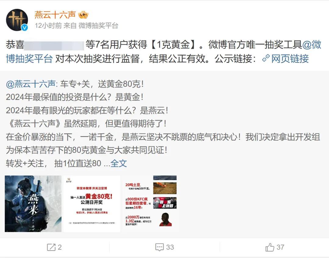 今年7月,在經歷四測後不久,燕雲宣佈原定於7月26日的公測延期,具體時間暫略,但每延期一天,就在微博官號抽一名用戶獲得1克黃金。依照黃金市價,從7月份送到現在,送了十多萬。