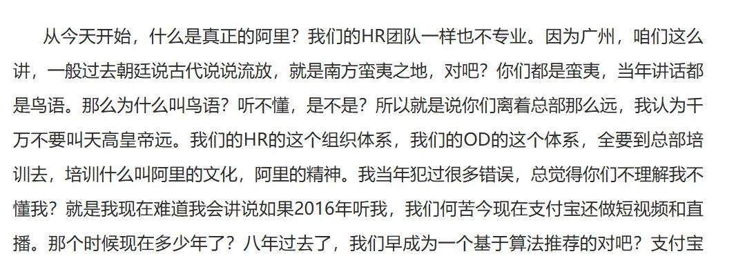 - 因爲這家公司在以前的管理層帶領下走火入魔過,我不認爲你們具備阿里的這種價值觀、使命願景這套體系。所以就是說你們要重新學習,重新認識阿里。