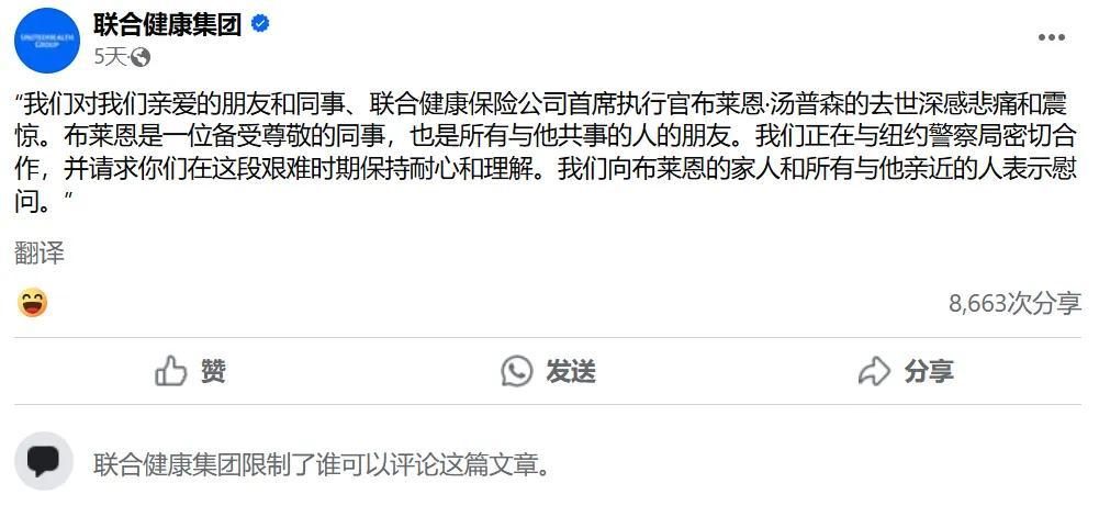 巧的是,美國聯合健康保險公司的風評並不好。案件發生後,公司在網上發表了一則悼唁,結果引來了鋪天蓋地的聲討,最後不得不關閉了評論區。