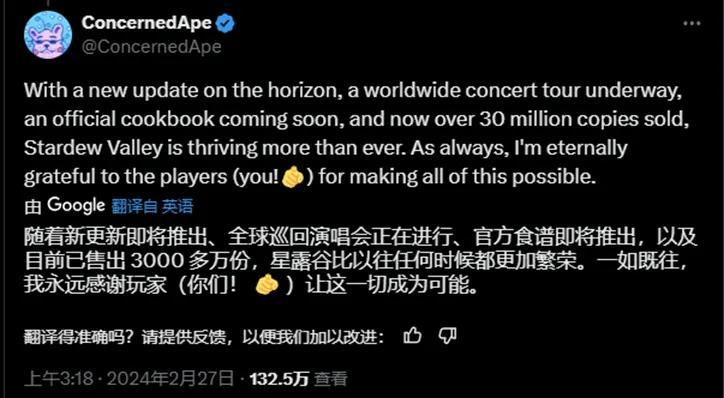 今年2月份時,開發者ConcernedApe還在個人推特上宣佈遊戲的全球銷量已經突破了3000萬份: