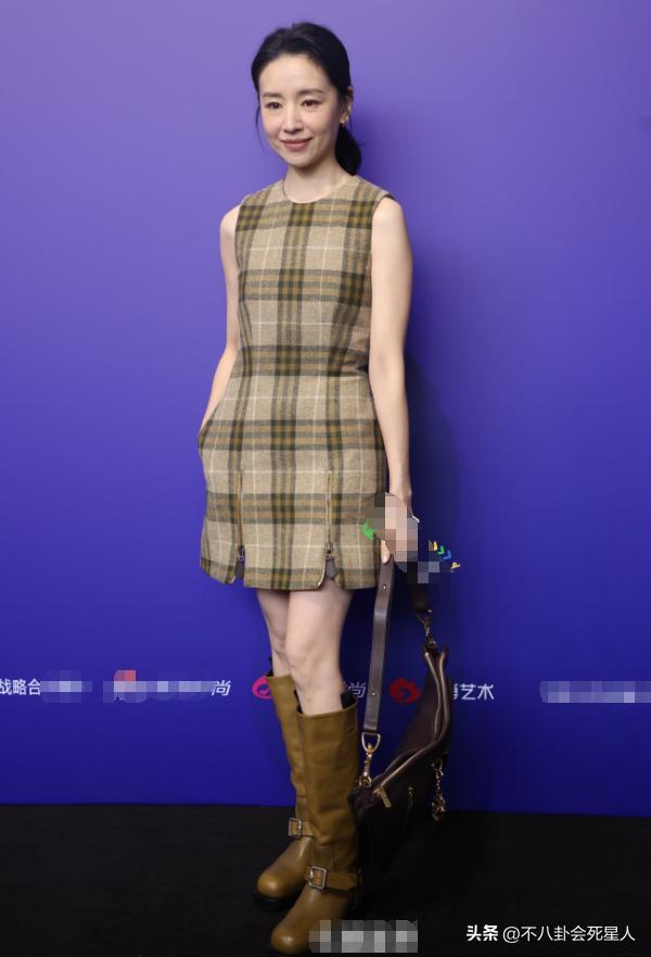 當天董潔穿的是一條頗具活力的格子背心連衣裙,下面搭着一雙同色系靴子,頭髮利落地綁了一個馬尾,她的妝容也偏淡,但卻很符合她本身清冷的氣質。