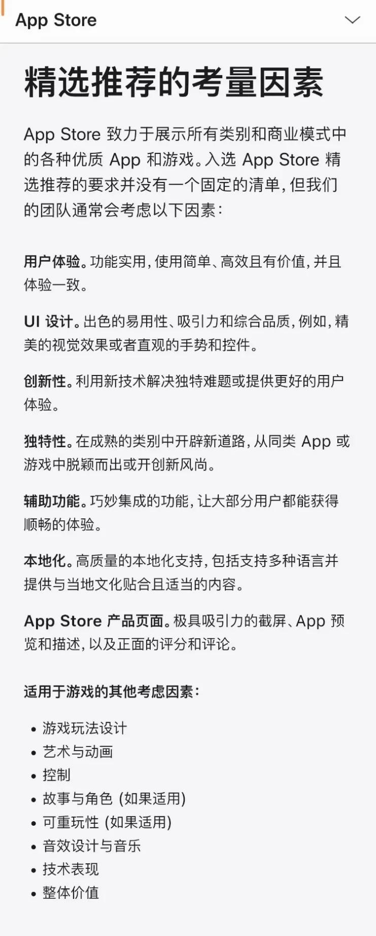 以App Store爲例,在蘋果官方給出的編輯推薦考量因素裏,我們可以從中發現一點端倪。