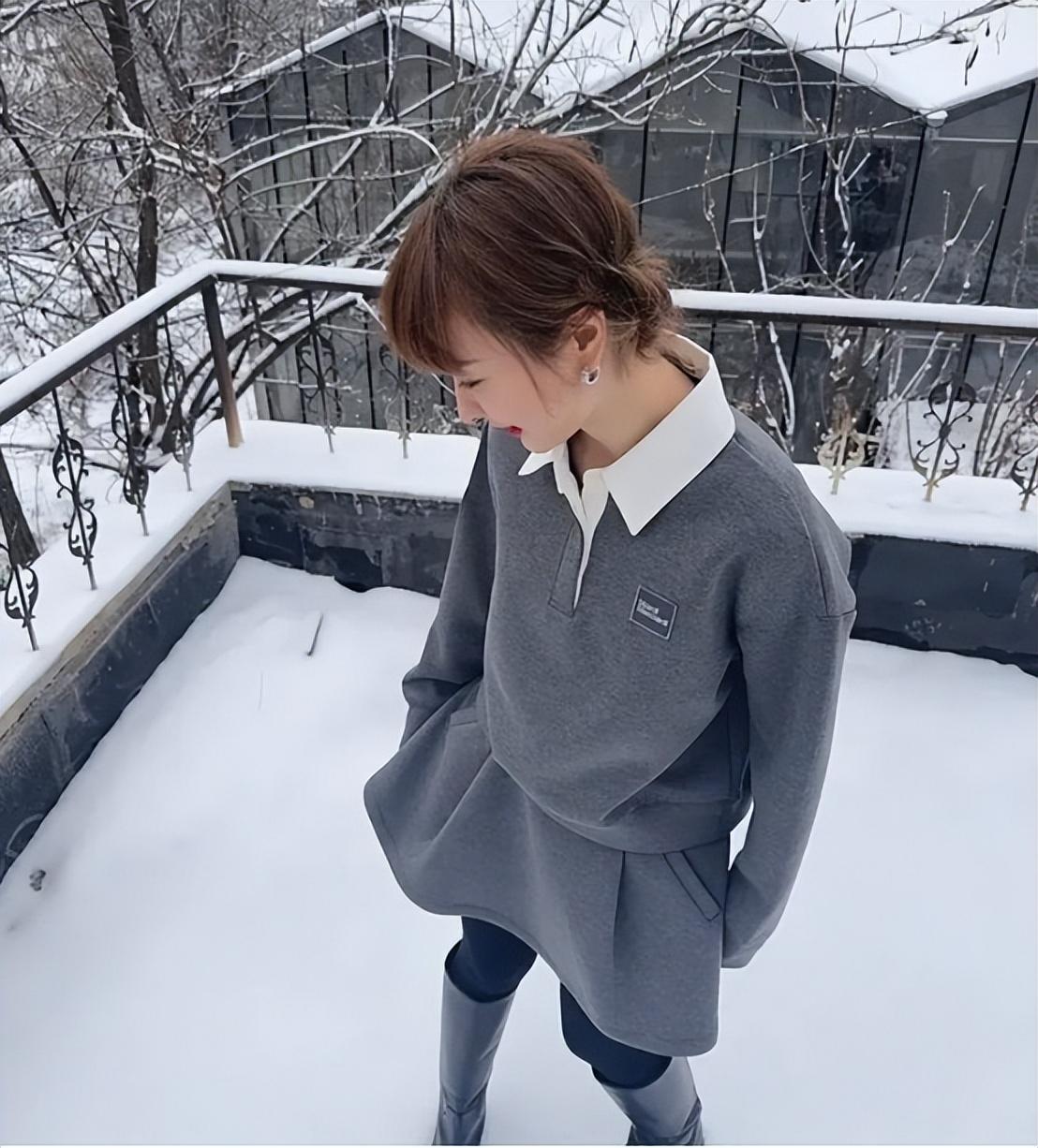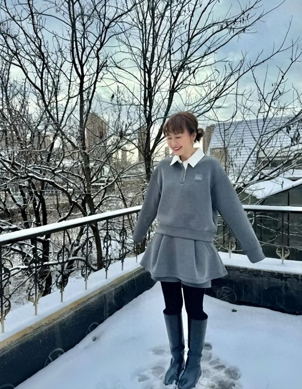 現在的吳昕徹底翻身了,無論是妝發還是穿搭都很適合自己,品位真是越來越高了!在雪地裏穿着灰色衛衣配短裙,顯得少女感十足,冷棕色的髮色襯托的她皮膚白皙透亮,再加上精緻的妝容,顏值分蹭蹭往上漲。