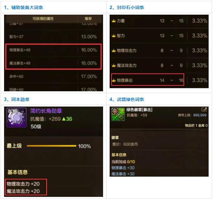 所以我們需要從輔助裝備詞條、封印石、精髓、團本勳章、綠色徽章等細節補上暴擊!