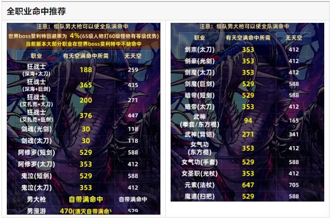 大家可以看一下全職業推薦的命中,雖然65級玩家打60級怪物有等級壓制;