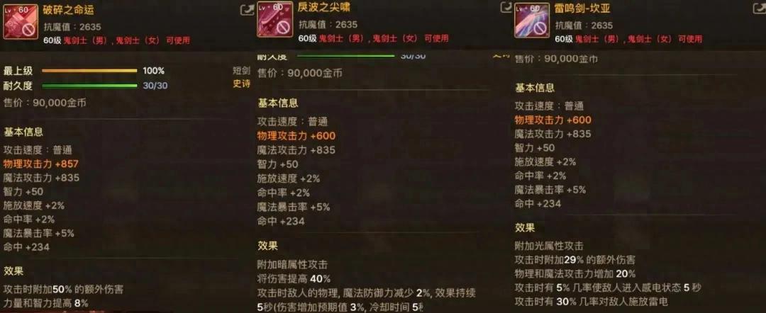 60級史詩短劍總共有3把,“雷鳴劍”自帶光屬性攻擊,“戾波之尖嘯”自帶暗屬性攻擊”,所以很多兄弟都會誤認爲這2把武器纔是畢業選擇。