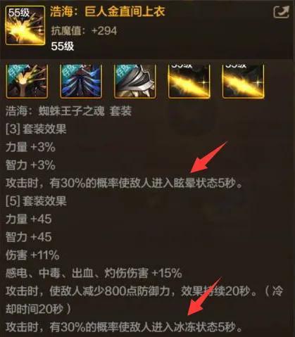 攻擊有30%概率讓敵人進入眩暈和冰凍狀態,說實話這套裝備的爬塔效果更好;