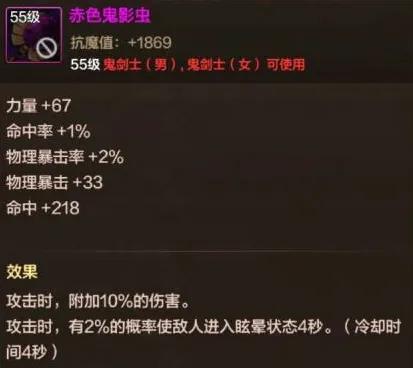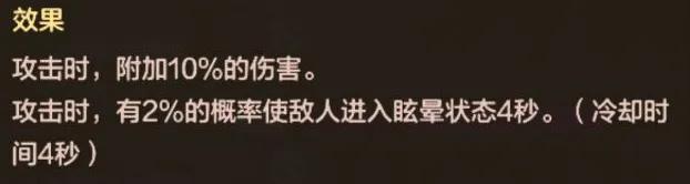 核心屬性爲:+10%附加傷害,攻擊時有2%概率讓敵人眩暈4秒,冷卻時間4秒!