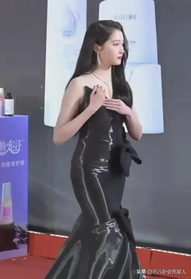 像關曉彤這條包臀黑色魚尾裙,雖然裙子本身很有女人味,但關曉彤就沒有穿出嫵媚性感的感覺,反而有點顯壯了。