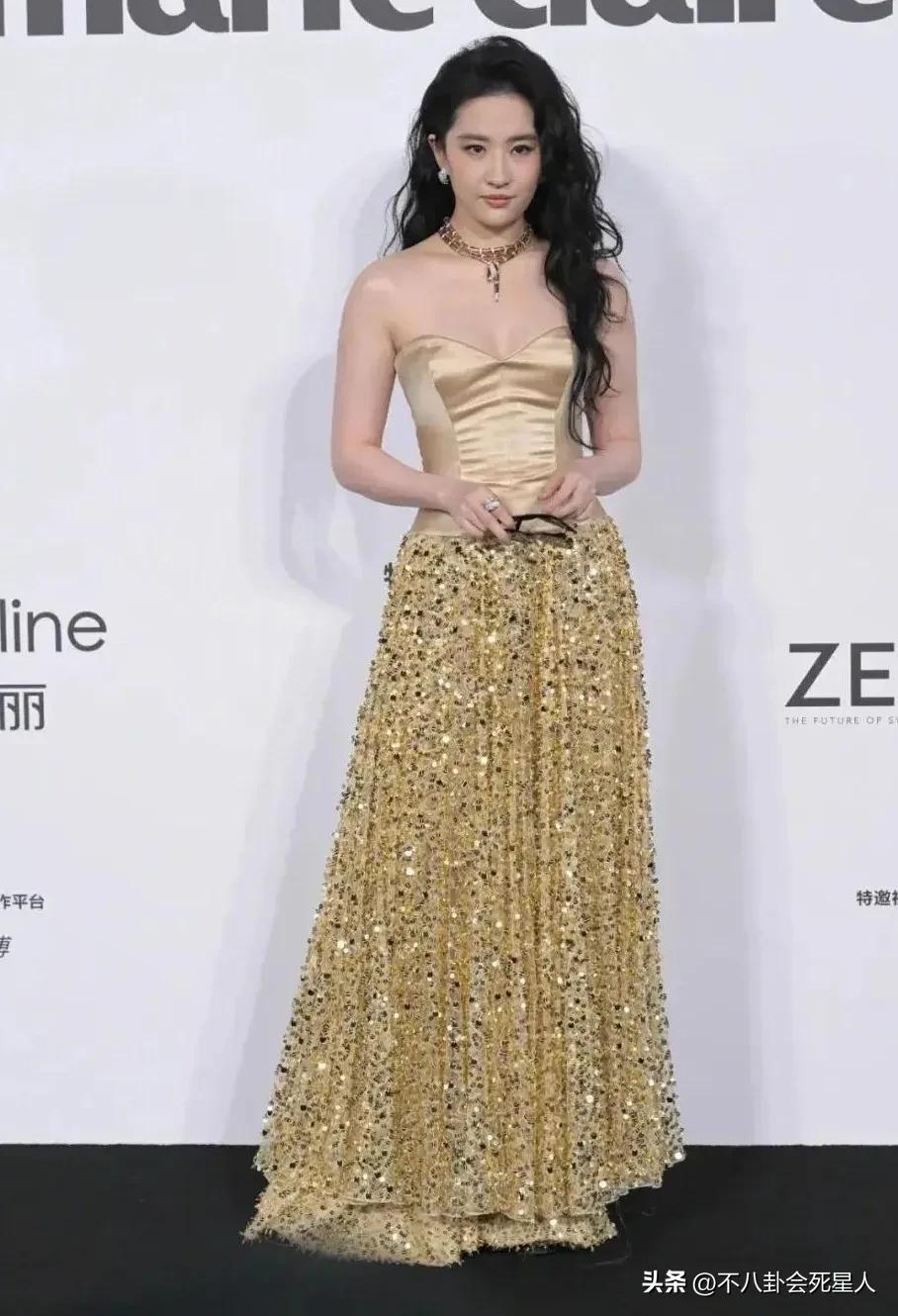 劉亦菲穿的是金色亮片抹胸禮服,這個顏色在這次紅毯上還是很與衆不同的,這條禮服很顯貴氣,很適合“人間富貴花”長相的劉亦菲。