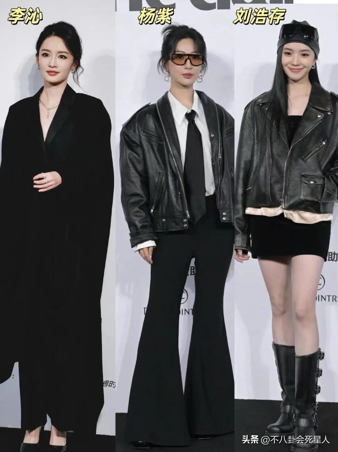 郭采潔穿得也狠辣,上半身是露腰背心,不過整體風格還是偏“酷辣”的,加上短髮和纖瘦的身材,比起楊冪少了幾分性感。