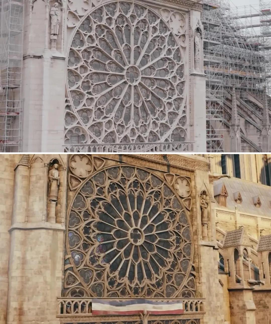現實中的玫瑰窗(上)和遊戲中的(下)對比,另外,玫瑰窗在2019年中的大火中毫髮未損,算是不幸中的萬幸