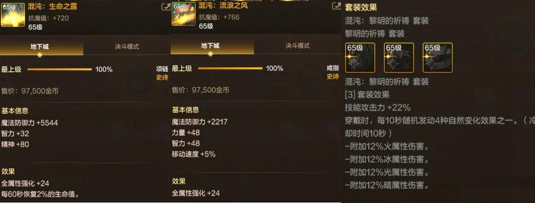 第二、“混沌首飾”依舊推薦波動套和黎明祈禱套,“波動套”更穩定,“黎明祈禱套”上限高,但比較隨機。