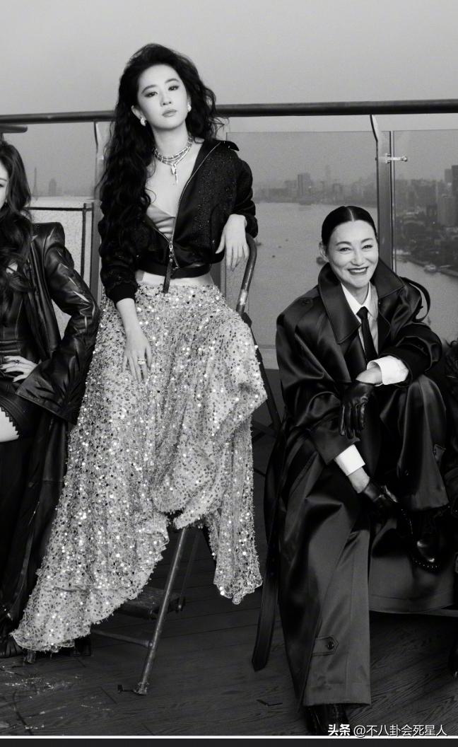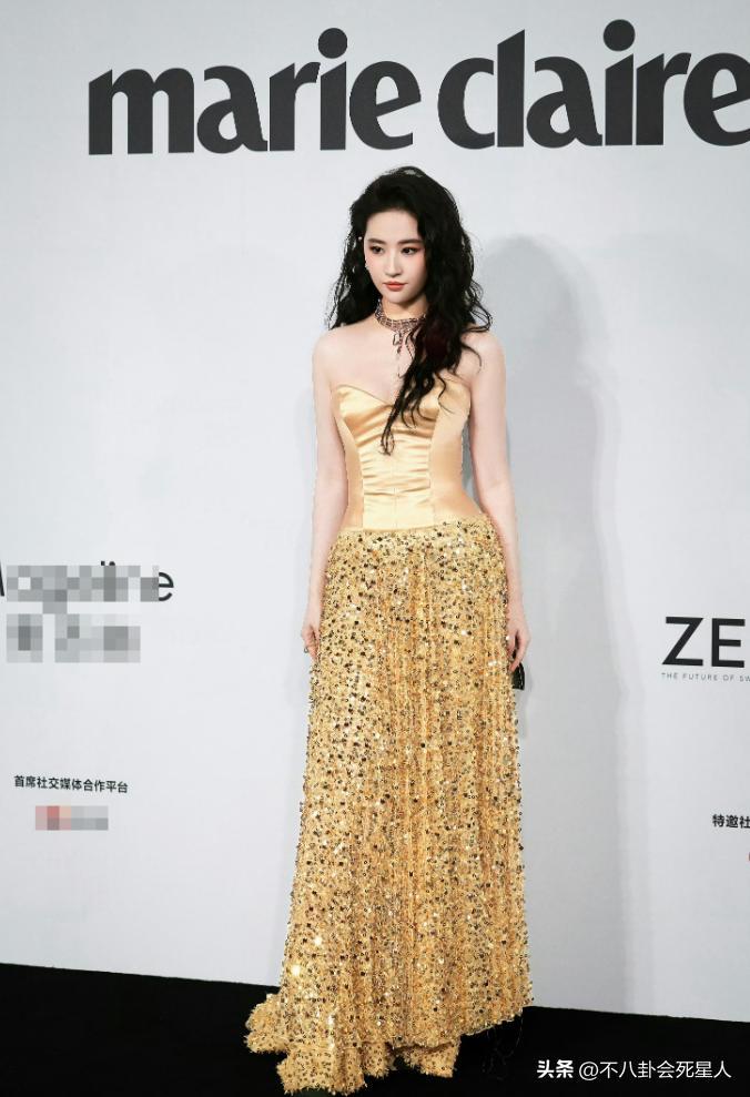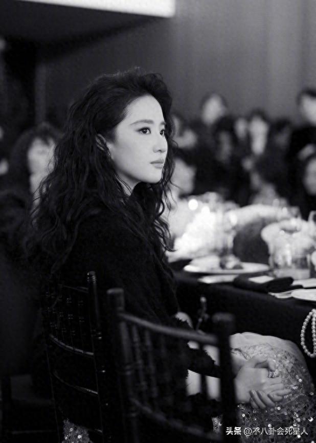 其她女星都是一身黑色禮服,唯獨劉亦菲穿了一件金色長裙配黑色夾克,且只有她在整個畫面上坐得最高,讓人第一眼就捕捉到她,而其她人都成了陪襯。