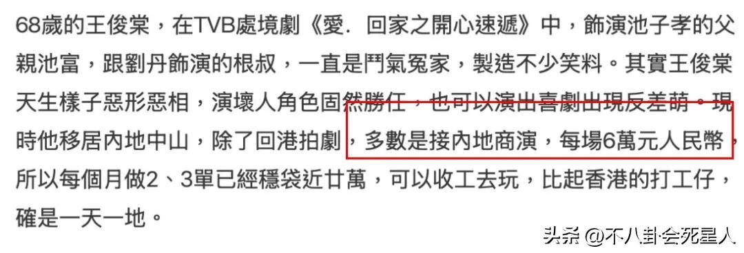 年近70歲的王俊棠在內地工作很輕鬆,一個月大約接三四個商演,但他每場商演就能賺到6萬元,也就是說一個月下來至少也能賺18萬元,這個月收入雖然達不到一線明星,但足夠他一家人在內地過上富足生活了。