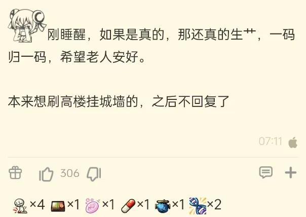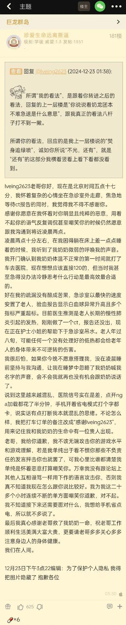 珍愛生命在凌晨五點半又發了條回覆,語氣再沒此前的攻擊性,他說正是因爲和lveing吵到三更半夜睡不着覺,才讓他有機會在深夜注意到老人微弱的呼喚聲,從而發現其身體不適,及時送醫並得到了救治。