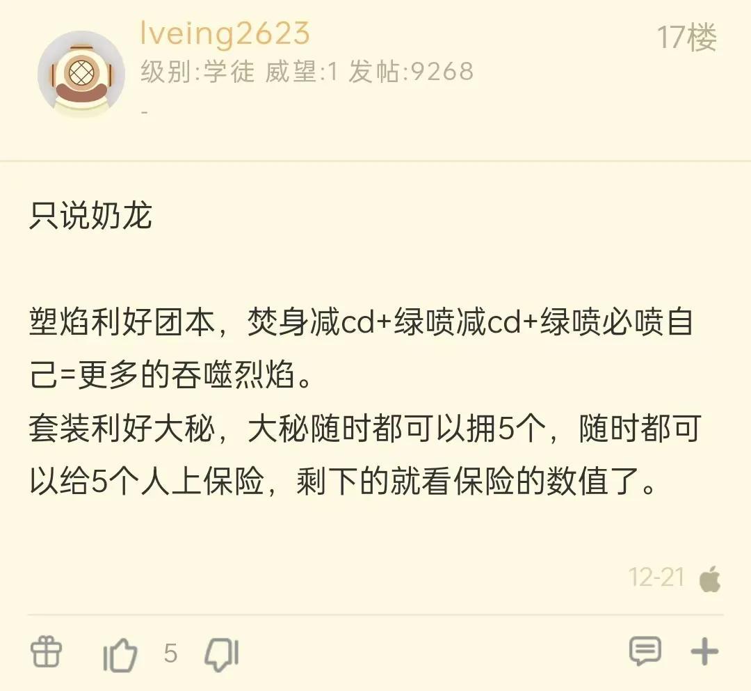 一名ID爲lveing2623的用戶(姑且簡稱爲lveing)留言說他覺得這改動利好“奶龍”,也就是“恩護”專精擔任奶媽職業的喚魔師,看好其在團本中的表現。