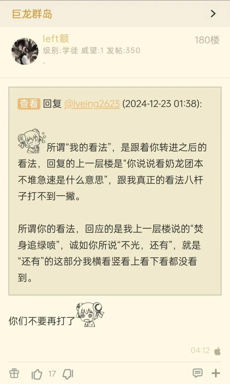 180樓的帖子裏兩人的爭吵得佔九成,甚至整個板塊裏一週的回帖數總和大概都沒他倆兩天裏吵的多,到了發帖者都出來勸和說“你們不要再打了”的地步。