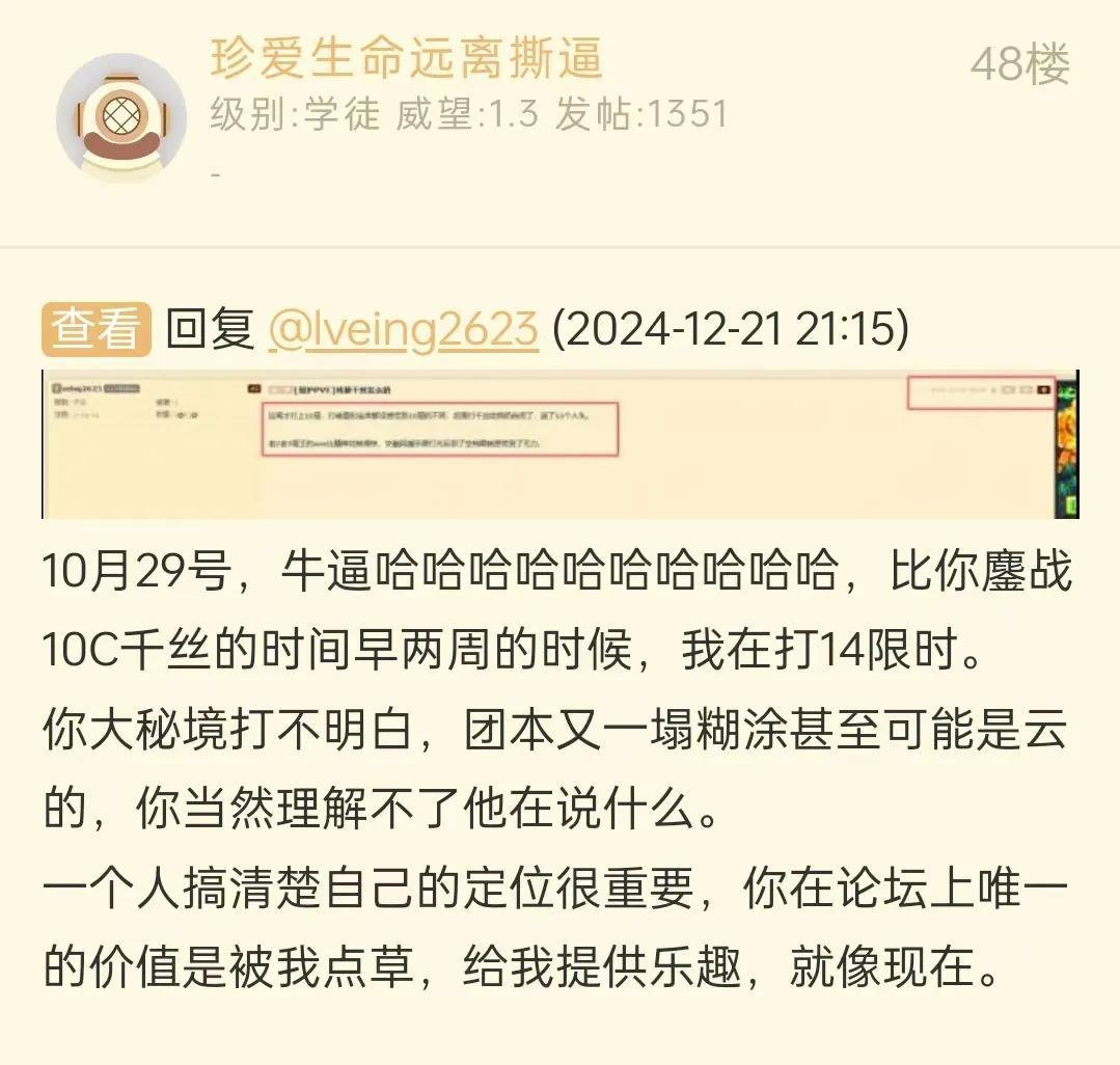 隨着另一名ID爲“珍愛生命遠離撕逼”(以下簡稱爲珍愛生命)的用戶加入戰局,樓裏的火藥味也愈加濃烈起來。珍愛生命明顯不再願意像樓裏其他網友那樣“慣”着lveing,他開始翻lveing的舊賬,查他的副本進度,試圖以此來證明lveing魔獸玩兒得很菜,打擊他在這個話題上的發言權。