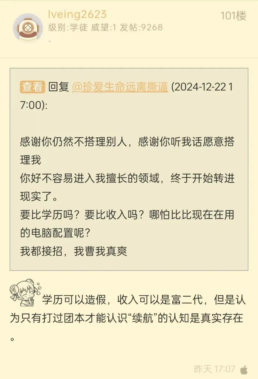 樓裏其他玩家大多並不贊同他的觀點,給出不少論證。但只要有人反駁,lveing就也不露怯,總是順着自己的邏輯回覆一通,雙方誰也說服不了誰。