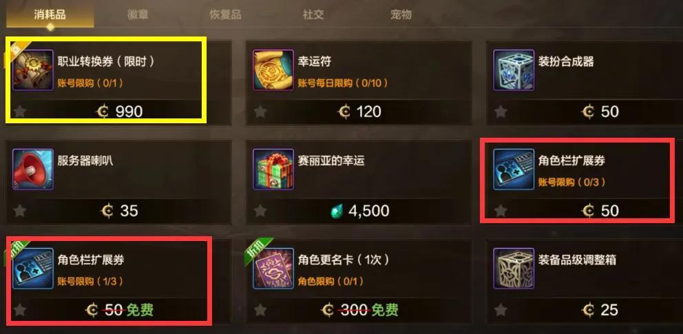 “角色欄擴展券”,商城新增了2個,一個免費的,另一個售價50點券。