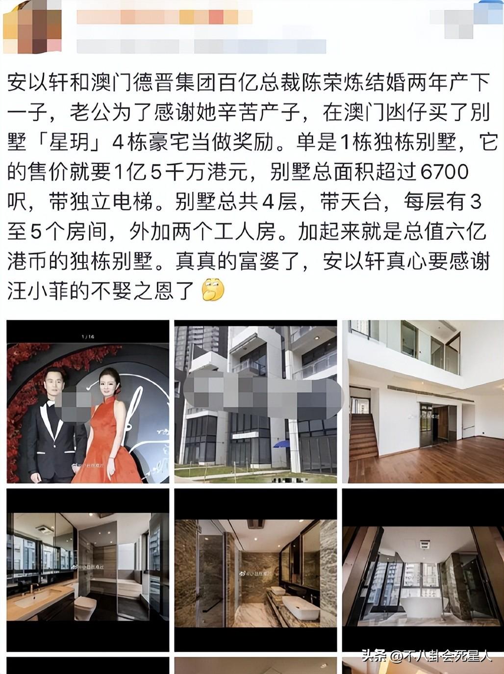 婚後安以軒生下一對子女,並且退圈專心當“豪門貴婦”,陳榮煉對安以軒十分寵愛,生一胎送了價值5億的豪宅,生二胎送價值15億元的公司股份。