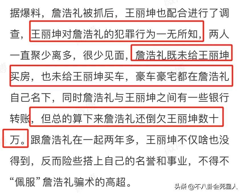 有爆料稱,王麗坤不但沒有從詹浩禮身上拿到房子車子,反而在兩人的轉賬來往中,王麗坤還倒貼了詹浩禮幾十萬元,可以說王麗坤這回是“人財兩失”。