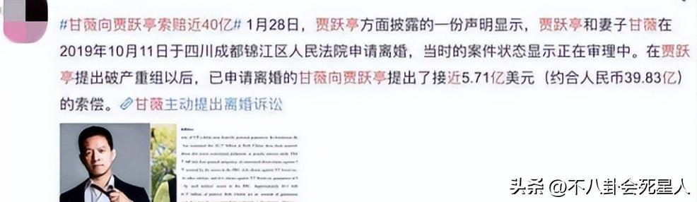 2019年,甘薇已經申請和賈躍亭離婚,並且向賈躍亭索取近40億元的賠償。