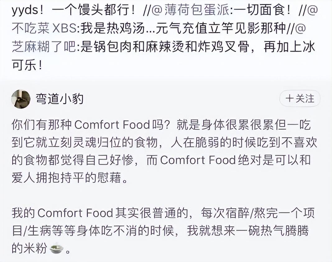 這類食物通常是高油高糖碳水化合物,也有網友談到自己的comfort food時會提起一些象徵着歸屬感、思鄉情懷,與某些童年回憶意涵連結的特定美食。
