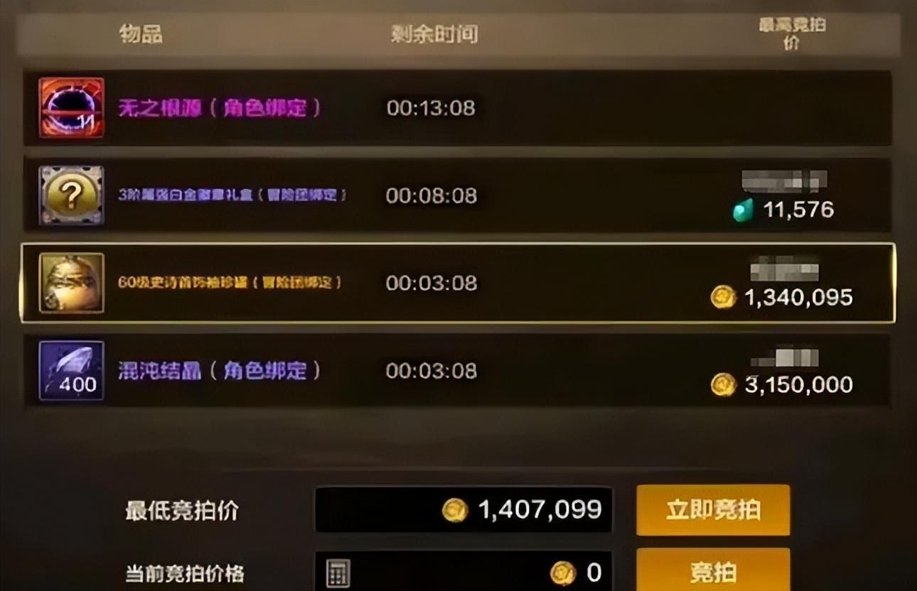 一是“起拍價”,比如“史詩罐子”“混沌結晶”就可以用金幣入手,