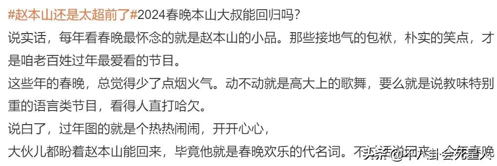 67歲的趙本山罕見被“送”上熱搜同樣是因爲觀衆們對春晚的“懷念”,每年的春晚前夕,趙本山這個名字都會被觀衆們重新提起,大家的感慨幾乎一致,那就是懷念趙本山時期的春晚節目。